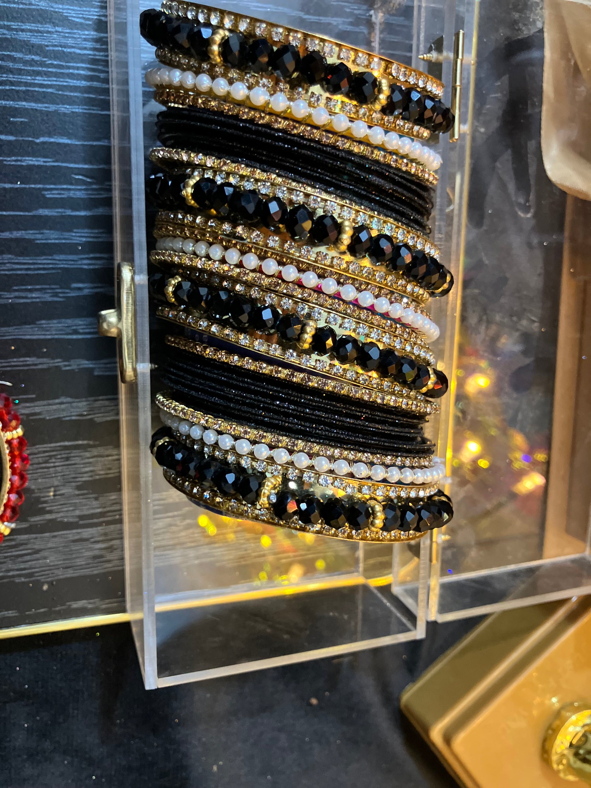 Gracefully designed metal bangles adorned with lustrous pearls and sparkling rhinestone embellishments.