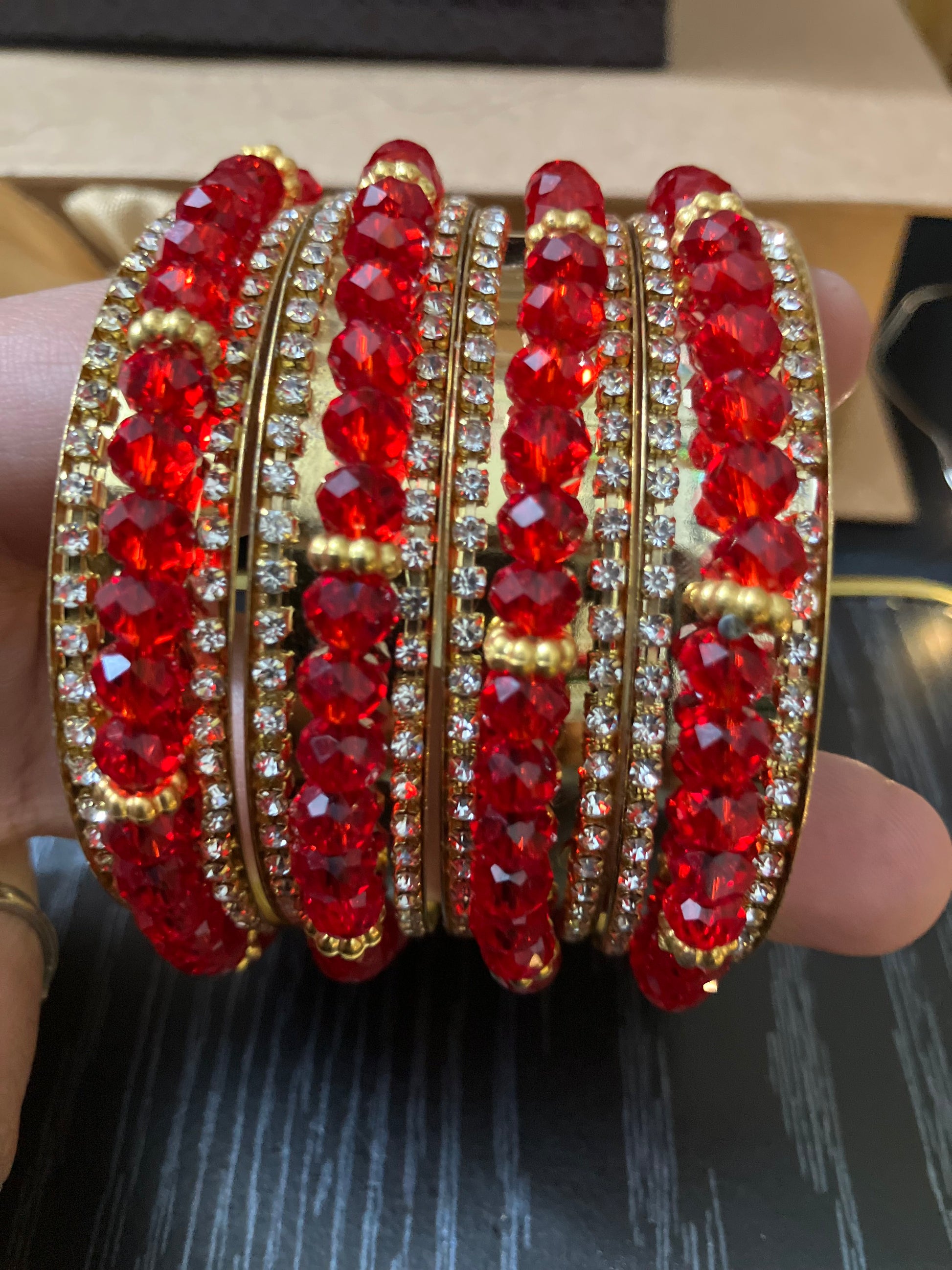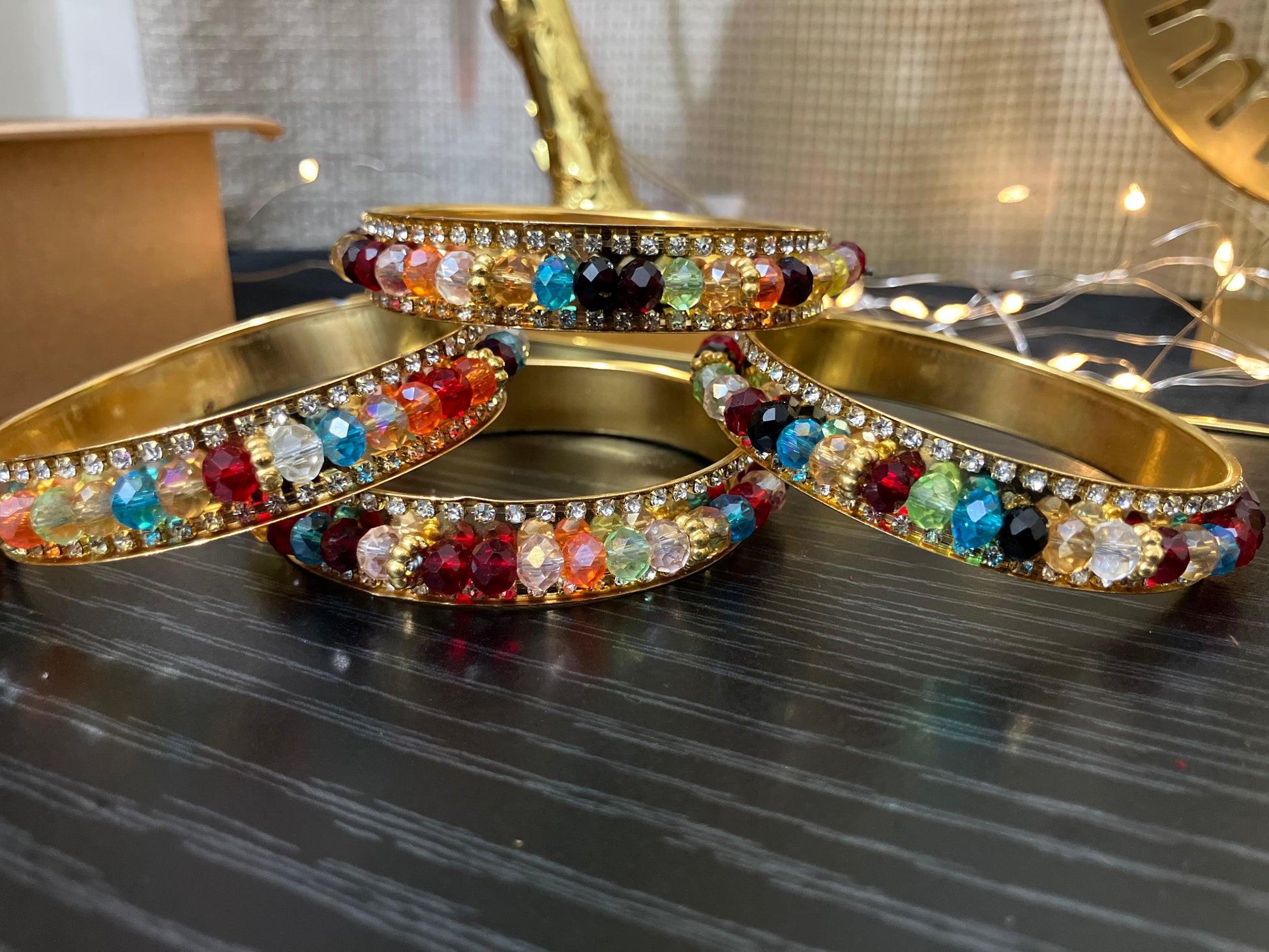 Elegant gold-plated bangles adorned with shimmering faceted beads that reflect light beautifully.Perfect for adding a touch of sparkle and sophistication to both traditional and modern looks.