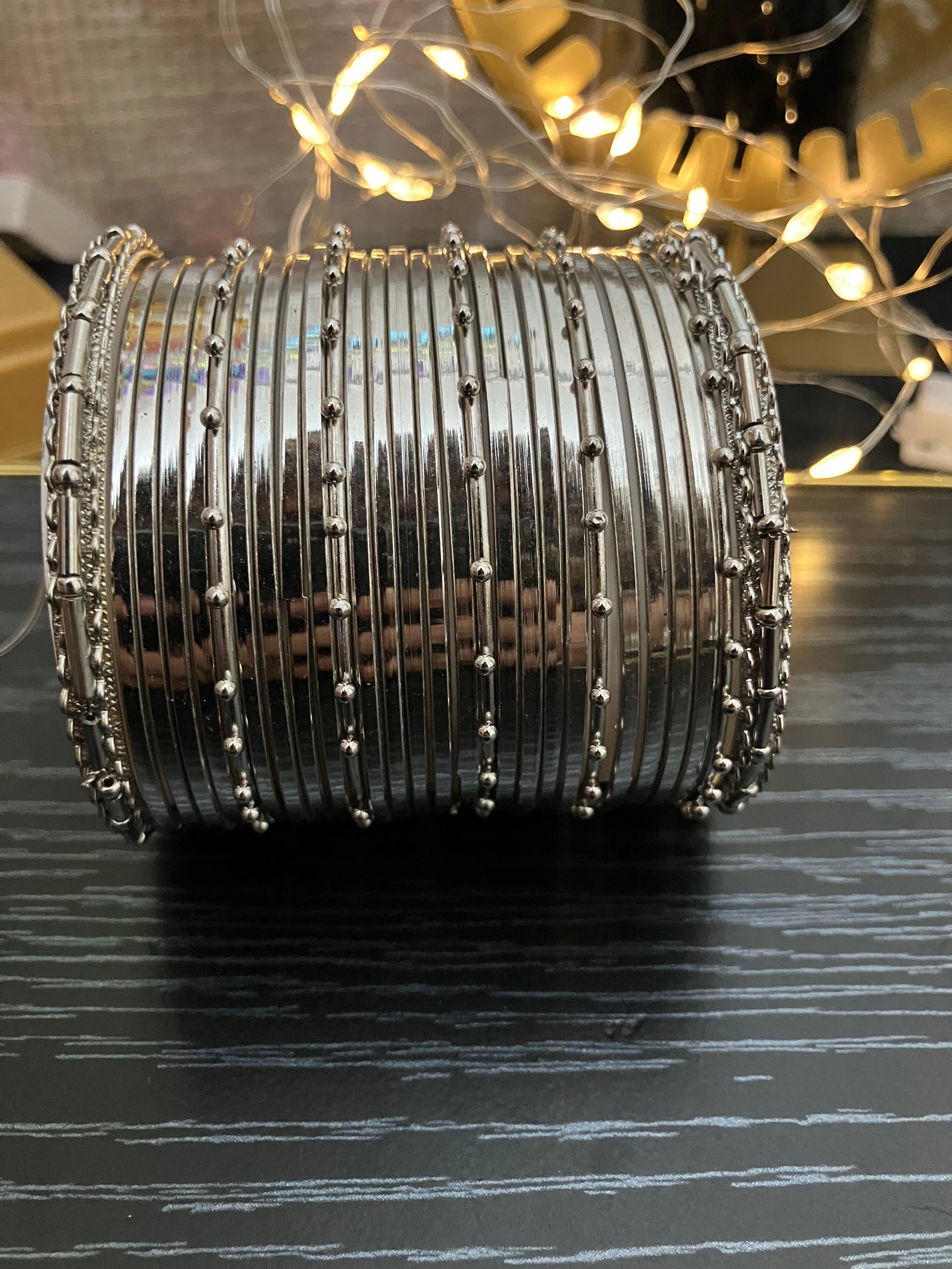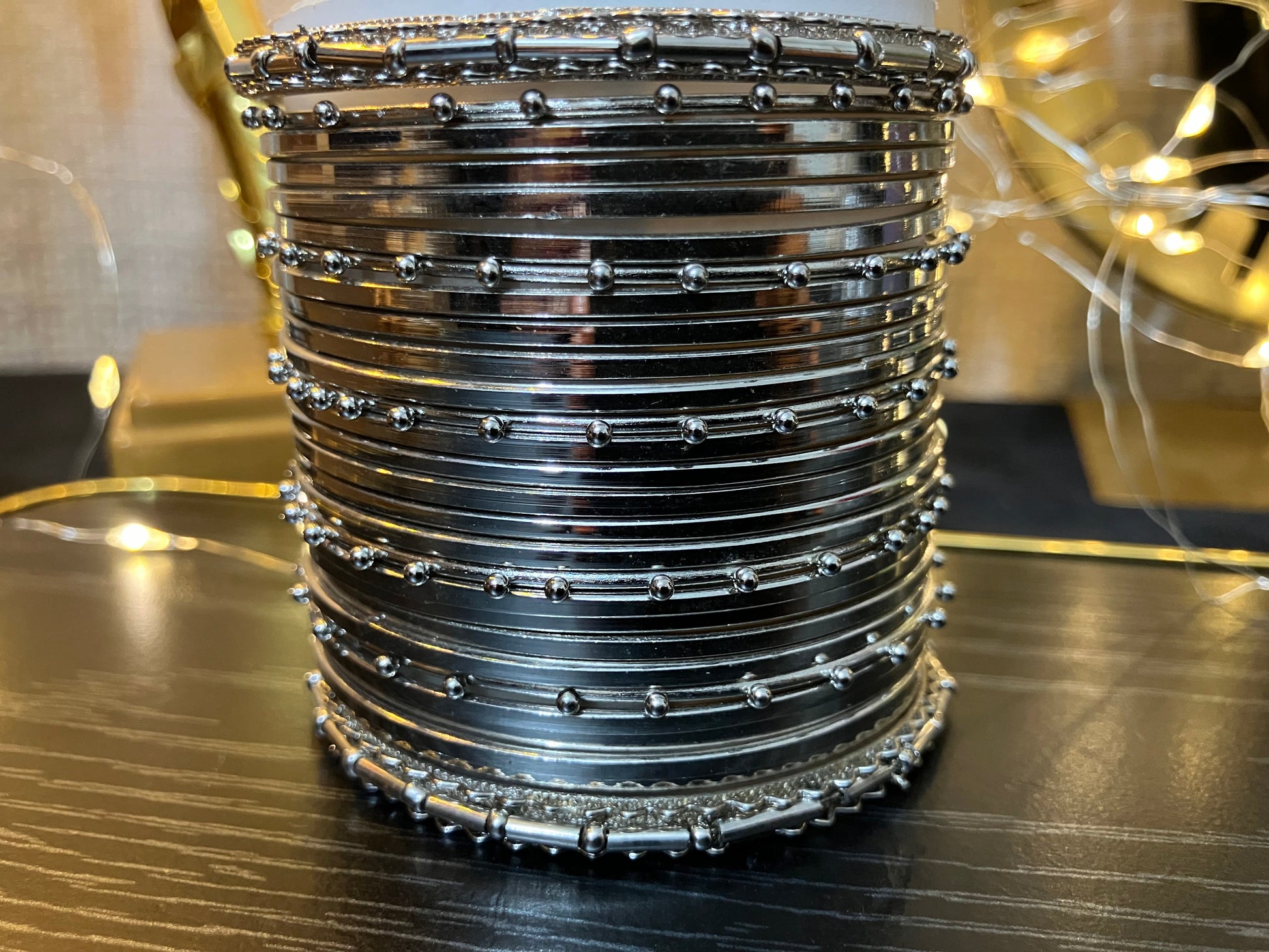 Elegant silver-colored bangles adorned with delicate dotted detailing for a subtle yet stylish look.
